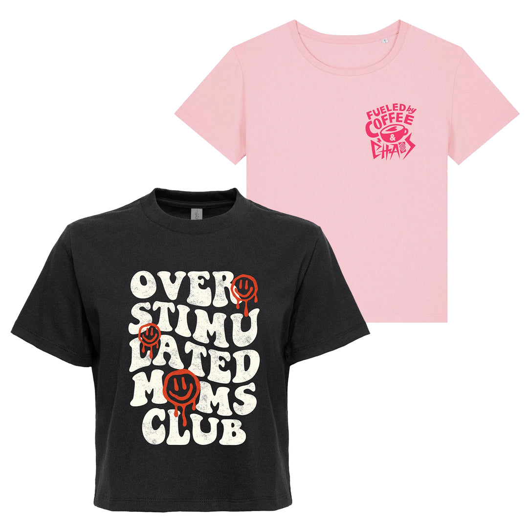 Overstimulated Mom Bundle: Overstimulated Mom's Club Midi Crop Tee + Fueled By Coffee & Chaos Ladies Tee