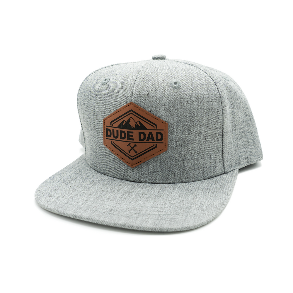 Grey flat bill snapback with engraved vegan leather patch. Adjustable snapback for all sizes.